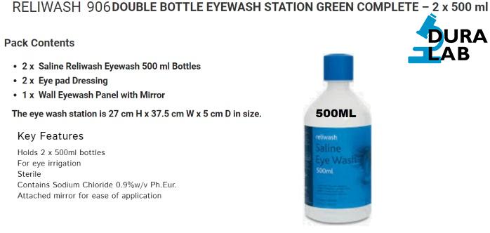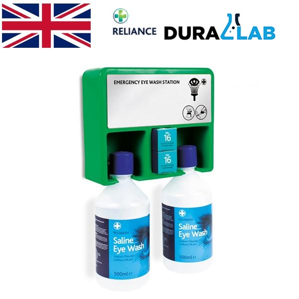 • Double eyewash station containing easy-to-use Reliwash saline eyewash