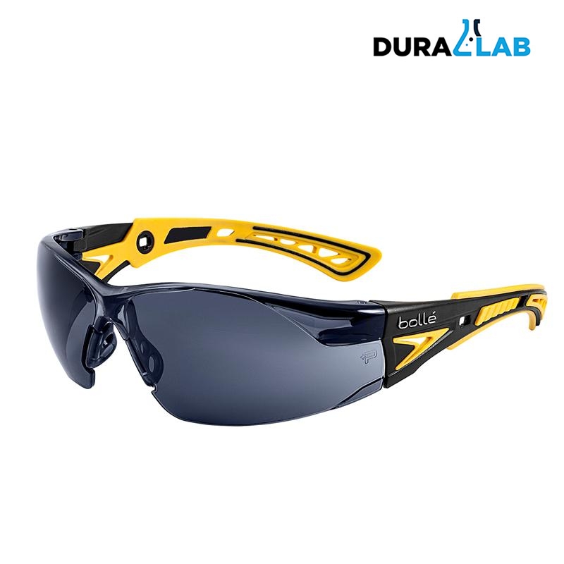 Rush+ safety glasses feature an ultra-sporty design, with co-injected, highly flexible bi-colored temples. Also features upper protection with a non-slip bridge. Lenses are anti-fog and anti-scratch coated on both sides and platinum coated.