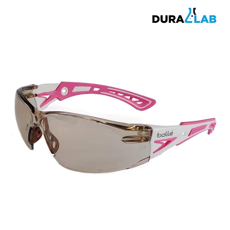 Rush+ safety glasses feature an ultra-sporty design, with co-injected, highly flexible bi-colored temples. Also features upper protection with a non-slip bridge. Lenses are anti-fog and anti-scratch coated on both sides and platinum coated.
