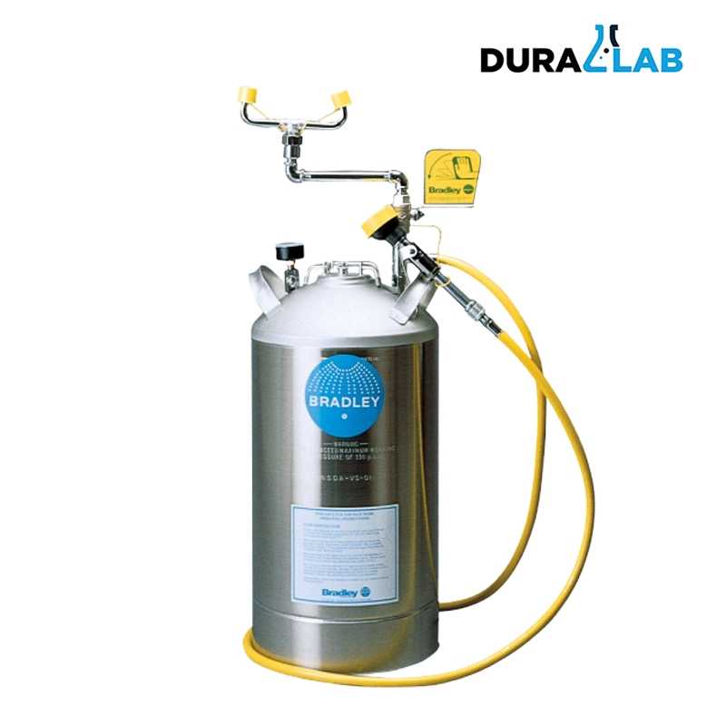 BRADLEY S19-690 Portable 10-Galon Stainless Steel Pressurized Emergency Eyewash Tank with 8′ Drench Hose Looking for a portable eyewash that will withstand corrosive materials in isolated locations, can be used on trucks or areas without plumbing that require a 15-minute flush? Bradley’s stainless steel portable pressurized tanks resist corrosion, and offer several options for customers that are looking for an eyewash with a drench hose, or even a tank outfitted with a heater jacket to prevent freezing. Portable pressurized tanks are a versatile, corrosion-resistant solution, to provide an ANSI compliant fixture in remote or non-plumbed locations.