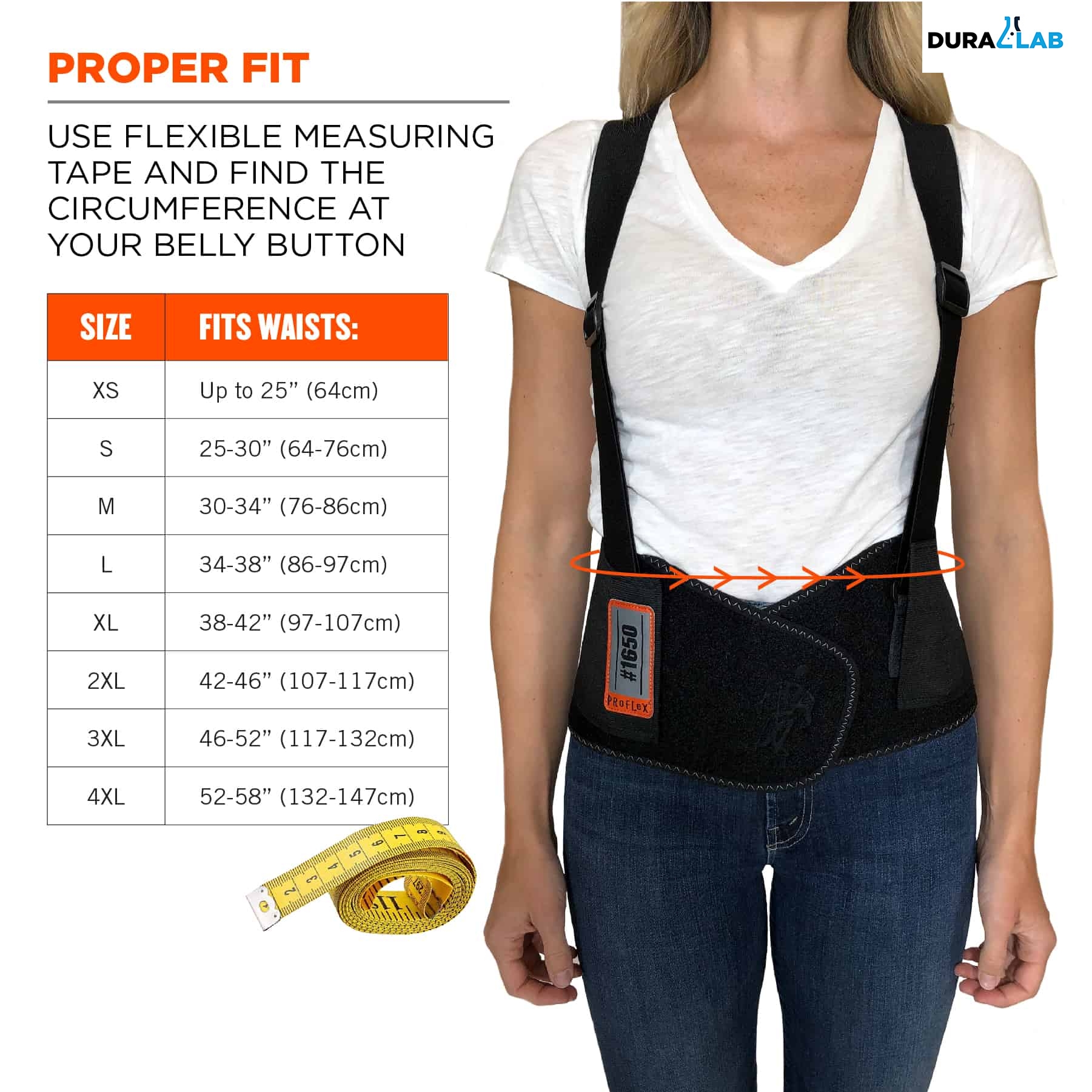 To choose your size, use flexible measuring tape and find the circumference around your body at your belly button. The support should fit snugly around your hips with the front of the support two-fingers width below your navel. An easy-to-use hook & loop closure keeps the belt securely fastened while in use and can be worn over or underneath clothing. Adjust the suspenders straps to fit securely on your shoulders without causing tension. Turn it into a back support belt by simply detaching the shoulder straps from the belt.