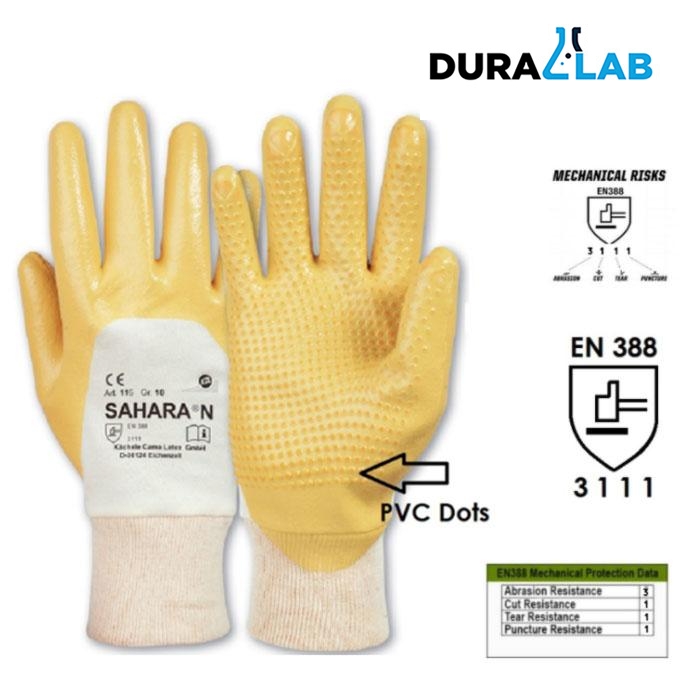 KCL GERMANY 115 Sahara N Nitrile Palm Coated PVC Dots Cotton Knit Wrist Glove Yellow 10″ Size 8, 9