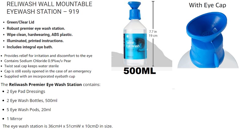 • Premier eyewash station containing an easy-to-use saline eyewash with eye cap