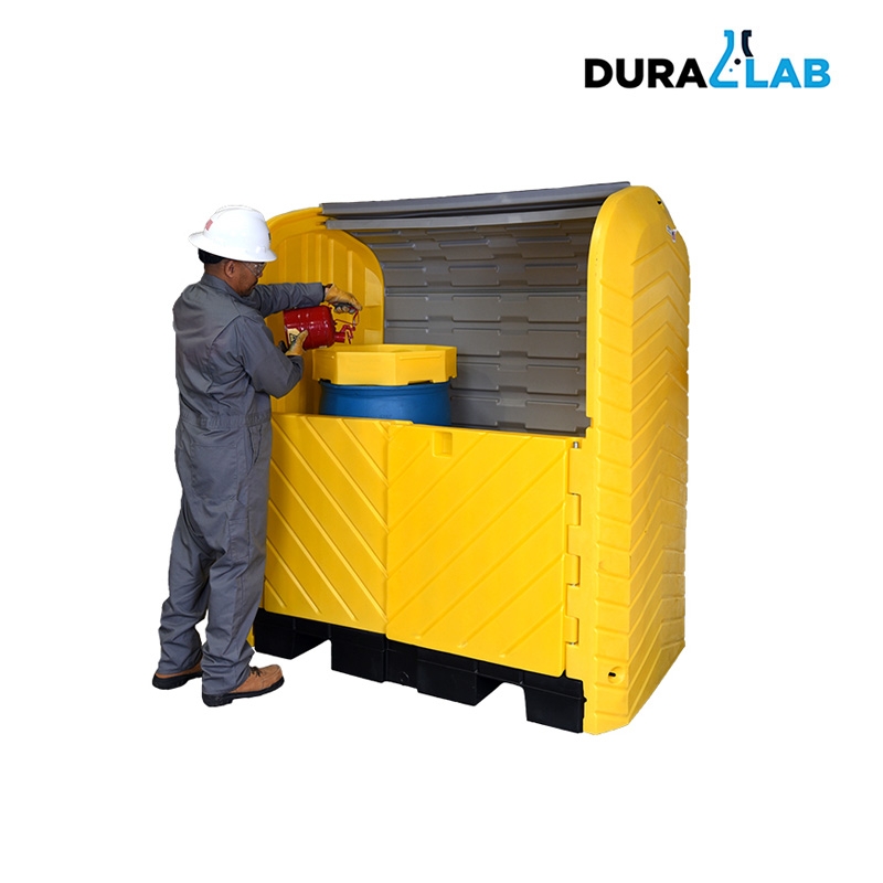 The Ultra-Hard Top P2 Plus Spill Pallet provides a safe, convenient and effective place to store one or two 55-gallon drums. The roll-top doors above and swing out doors below provide complete and easy access to the inside spill containment area.